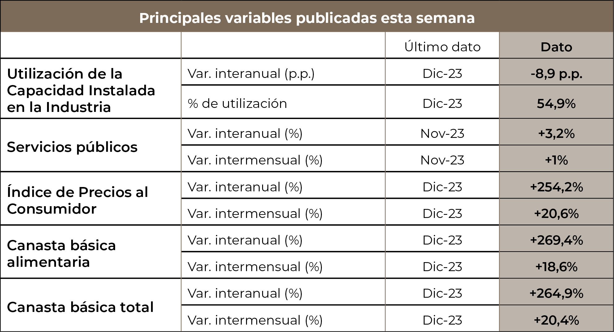 NÚMERO 1. 21 de febrero de 2024 | Nueva gerencia, nuevos rumbos | Con la llegada de Pablo Bercovich y de su consultora Marca PyME a la gerencia del Instituto del Mueble Argentino (IMA), el sector va a contar con un nuevo impulso hacia el aumento de la productividad y competitividad en una coyuntura que lo demanda de manera urgente. Todos los socios del IMA tendrán beneficios exclusivos: Una capacitación por mes en temas estratégicos de coyuntura y/o técnicos, vinculados a panorama nacional o sectorial, o a herramientas como transformación digital, innovación y diseño, desarrollo sostenible, certificaciones, desarrollo exportador, etc. Vamos a formarnos para crecer en productividad y competitividad. La primera capacitación será el 29 de Febrero y será sobre el rumbo de la argentina y del sector. Estará a cargo de Pablo Bercovich, director de la Consultora Marca PyME y ex Subsecretario PyME de la Nación, y de Martín Kalos, responsable del área económica de la Consultora. Newsletter semanal con noticias sobre la coyuntura y el sector. Vamos a informarnos sobre lo más importante a tener en cuenta para proyectarnos como empresas y como sector, vamos a difundir las convocatorias públicas y privadas disponibles y también la oferta crediticia. Servicio de clínicas personalizadas gratuitas. Vamos a ofrecer diagnósticos y consultas incipientes para mejora de producto, proceso y comercialización. Gestión de datos. Vamos a generar y profesionalizar el área de datos del sector para poder saber dónde estamos y dónde queremos ir. Vamos a hacer relevamientos, encuestas de seguimiento y análisis de perspectivas. Presencia de la empresa en redes sociales del Instituto y en prensa. Vamos a contar historias de las PyMEs del sector para difundir la tarea que hacemos y que todo el país pueda ver nuestros productos y el empleo que generamos. Proyecto Deseo. Vuelve la vinculación entre diseñadores y empresas del sector para crear valor y generar visibilización. Va a ser un laboratorio especializado que va a terminar con un nuevo producto comercializable por empresa, y va a tener un seguimiento profesional con asistencias específicas. Inscripción: abril 2024. Vamos a hacer crecer al sector de manera profesional y sostenida, con contenido útil para los socios y con una vocación de transformación productiva necesaria para el mueble argentino. | Coyuntura económica y política al 16 de febrero 2024 | En breve: la inflación (20,6% en enero) fue impulsada por la suba en regulados (26,6%) y seguirá siendo alta en los próximos meses (impulsada por energía, educación, salarios y una mayor devaluación). En marzo-abril el Gobierno deberá comenzar a implementar su plan económico de mediano plazo, con 4 opciones: estabilización, ajuste ortodoxo, dolarización total o dolarización parcial. Caída en actividad industrial y por ende en uso de la capacidad instalada (54,9%, el peor diciembre en décadas). | La inflación se desacelera, pero seguirá alta | • La inflación en enero fue de 20,6% intermensual (una leve desaceleración frente al 25,5% en diciembre, aunque todavía en niveles máximos históricos) y la interanual subió a 254,2% (desde el 211,4% i.a. alcanzado en diciembre). • La inflación núcleo también se desaceleró: fue de 20,2% intermensual (había sido 28,3% en dic-23) y 275,9% interanual. Los precios regulados aumentaron 26,6% mensual y 213,1% interanual, liderados por subas en nafta y transporte. Los precios estacionales se elevaron 16,2% intermensual (igual que en dic-23) y 200,4% interanual. • Tanto la inflación de diciembre (25,5%) como la de enero (20,6%) fueron prácticamente 5 puntos porcentuales menores a lo que previmos (30% y 25%) inmediatamente después de la devaluación de dic-23. También es cierto que hace un mes (19/ene) desglosábamos los aumentos anunciados y concluíamos que “sólo con estos cinco componentes (colectivos, gas, electricidad, educación y medicina prepaga), en febrero la inflación tendría un adicional de 16% y en marzo de 7%.” • Según los precios de alta frecuencia relevados por el CREEBBA, los Alimentos y Bebidas subieron 3,7% en la segunda semana de febrero, impulsados por alimentos preparados para consumir, lácteos y bebidas sin alcohol. Acumula (primera quincena de febrero vs. enero) una inflación del 13% en el mes, a menor ritmo que diciembre y enero pasados. | • Pero parte de la razón por la cual tanto diciembre como enero y ahora febrero están registrando una inflación levemente menor a la prevista es porque varios aumentos de precios se siguen posponiendo: en febrero efectivamente subieron subte (250%), tren (170%) y colectivos (250%), todos los cuales seguirán aumentando también en los próximos meses; y naftas (7%) y medicina prepaga (30%). Eso pone un piso alto para la inflación del mes, que (restando aún 13 días para terminar febrero) estará sin dudas por encima de los 15 puntos. • Hay otros componentes que entrarán a jugar recién en marzo: por ejemplo, los aumentos de tarifas de energía o el salario de encargados/as de edificios (medido en el Índice de Precios al Consumidor) que aumentó 11% en febrero pero cuya paritaria venció en enero (por lo cual en breve deberían renegociar). • También la educación, que se encontraba hasta enero 80 puntos porcentuales “atrasada” respecto del resto de los rubros del Índice de Precios al Consumidor; las subas de precios en útiles escolares (en algunas Provincias, como Mendoza, con subas de 250% en cartucheras), guardapolvos (que aumentaron 100% en varias Provincias, entre enero y febrero) y desde ya en las cuotas de escuelas privadas. No casualmente, el Presidente Milei anunció un subsidio estatal para que las familias puedan pagar útiles escolares y las cuotas de los colegios privados, a la vez que confirmó que no destinará fondos al Fondo de Incentivo Docente que constituía parte esencial del salario docente desde hace 25 a